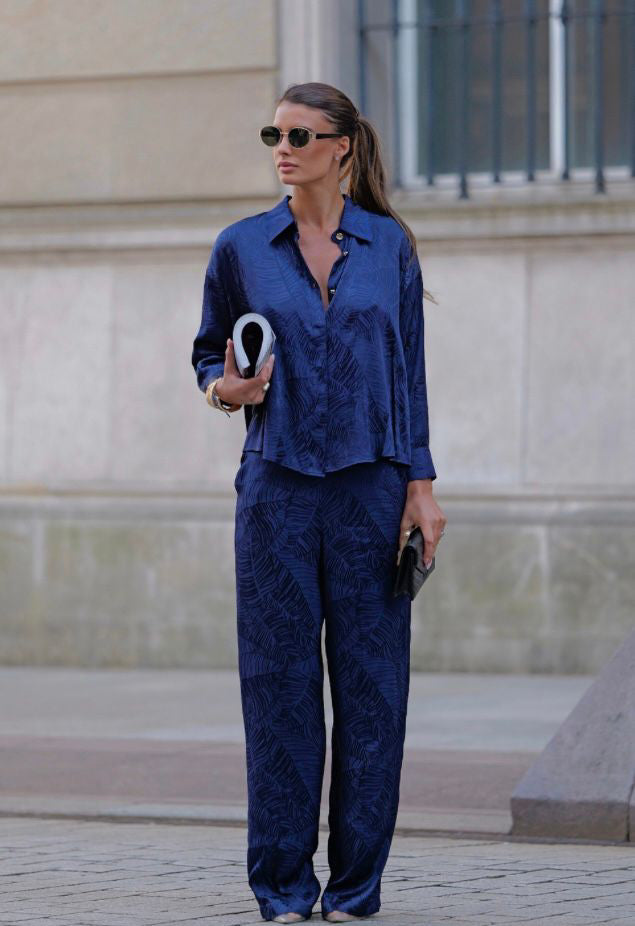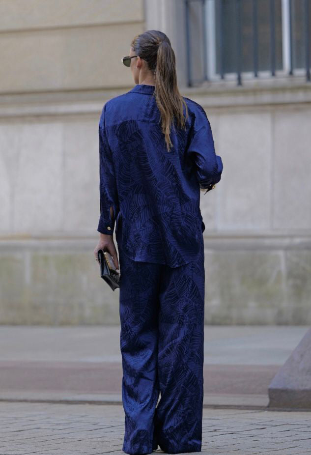 Estas elegantes calças palazzo apresentam o mesmo padrão jacquard exclusivo em tons de azul royal e azul-marinho, criando um conjunto coordenado sofisticado e cheio de personalidade.