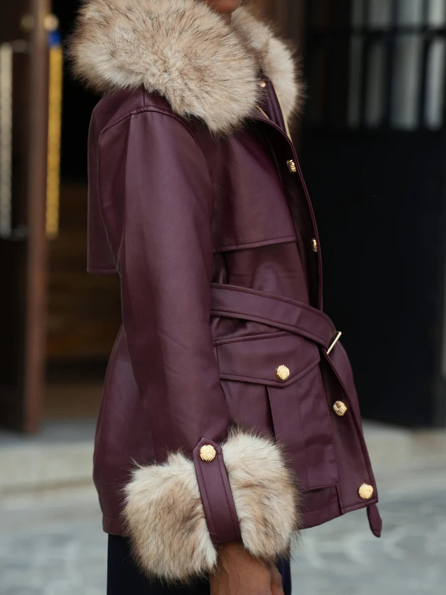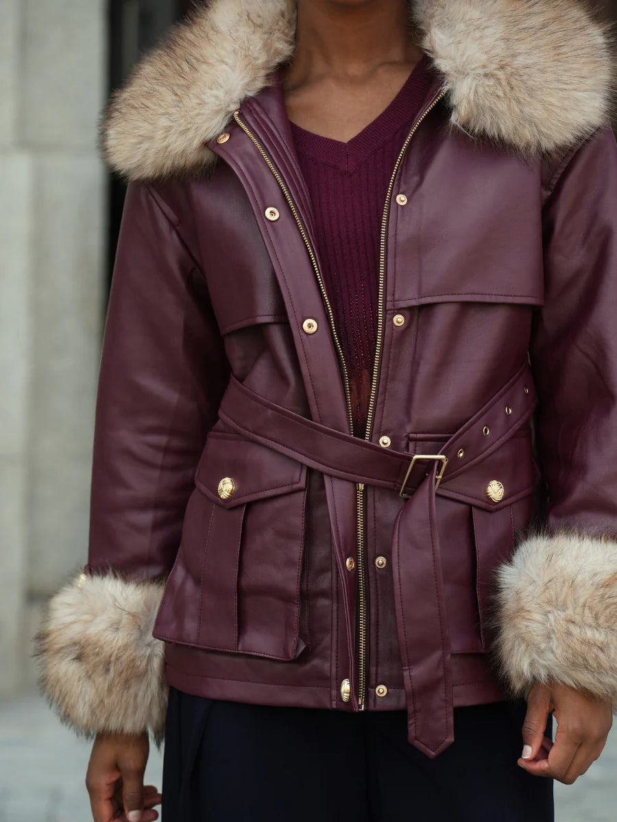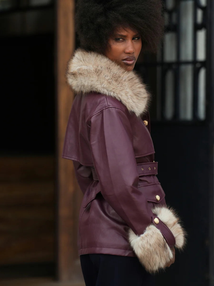 Casaco cintado em efeito pele com gola e punhos em pelo sintético volumoso. Com design utilitário, apresenta fecho frontal com botões dourados e fecho de correr oculto, bolsos de aba com botão decorativo e presilhas nos punhos. A estrutura marcada na cintura, reforçada pelo cinto ajustável, confere uma silhueta feminina e sofisticada. Um statement piece para dias frios.