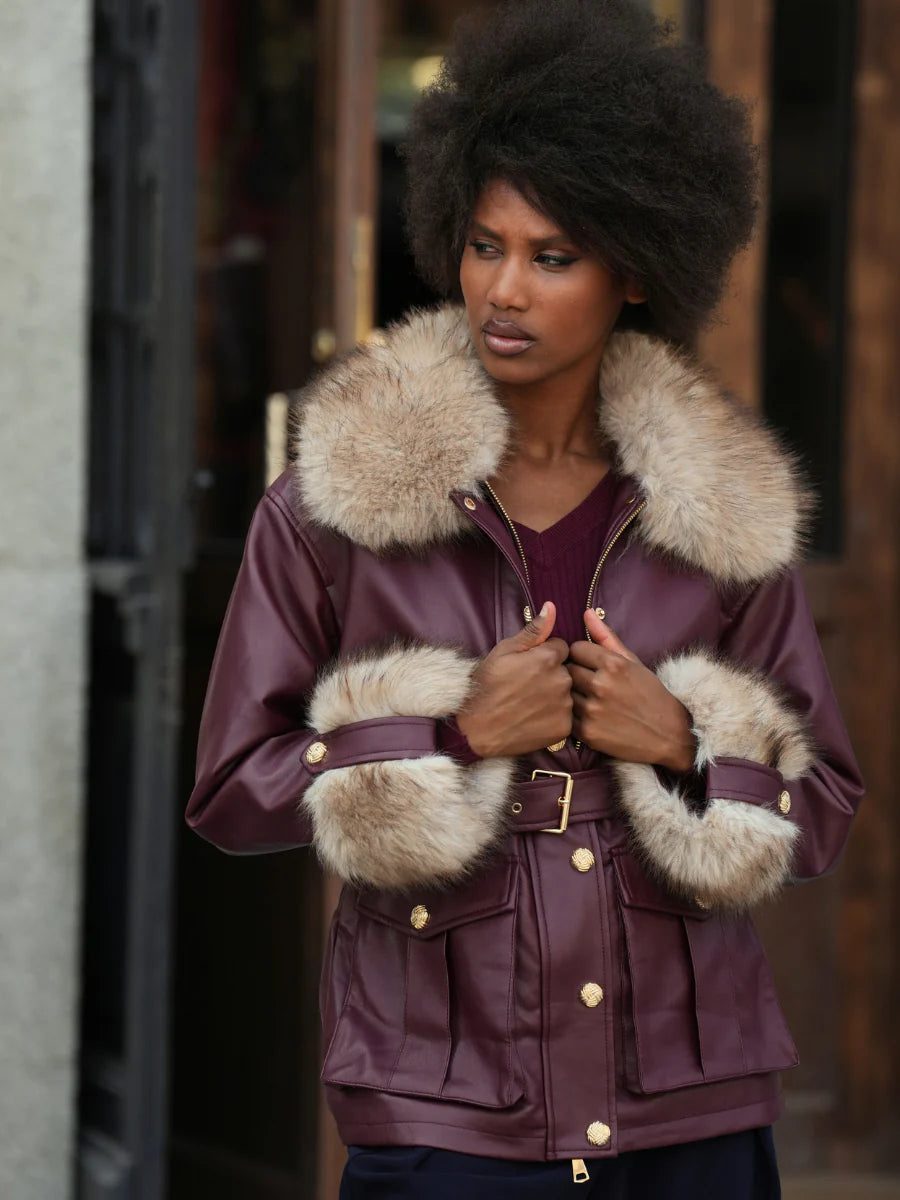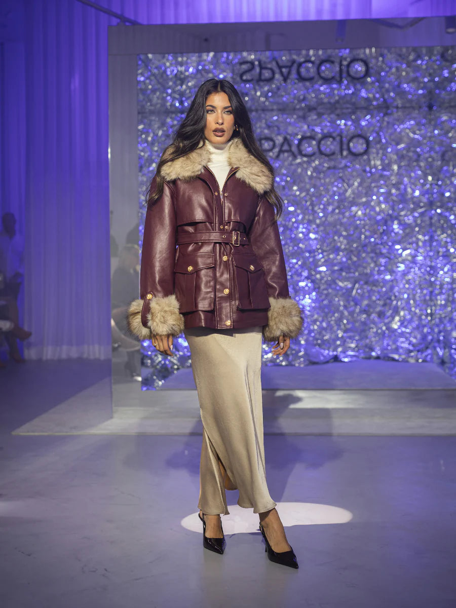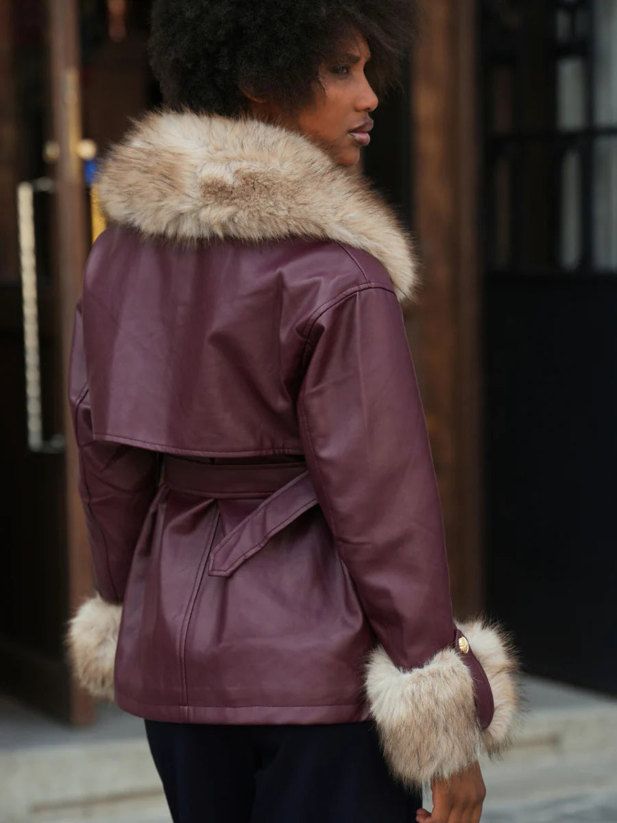 Casaco cintado em efeito pele com gola e punhos em pelo sintético volumoso. Com design utilitário, apresenta fecho frontal com botões dourados e fecho de correr oculto, bolsos de aba com botão decorativo e presilhas nos punhos. A estrutura marcada na cintura, reforçada pelo cinto ajustável, confere uma silhueta feminina e sofisticada. Um statement piece para dias frios.