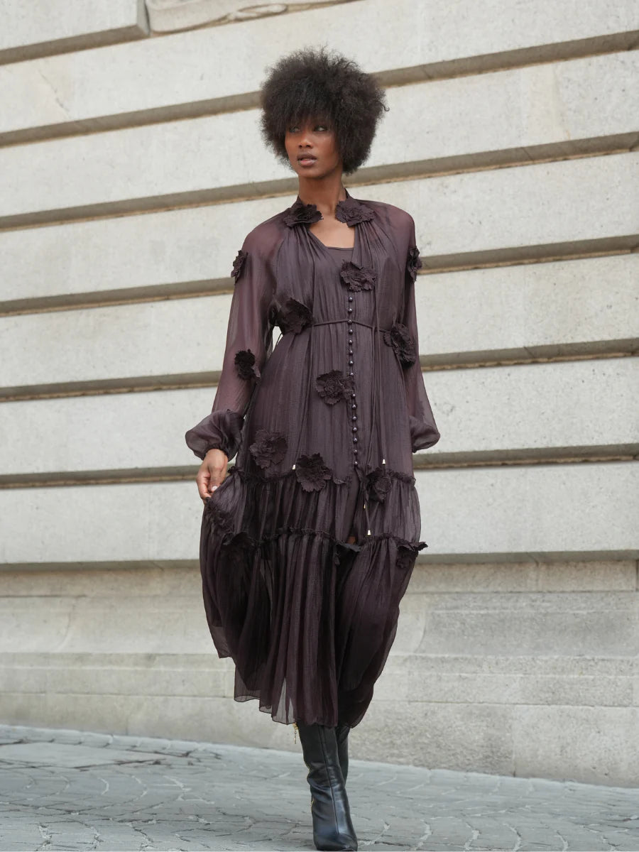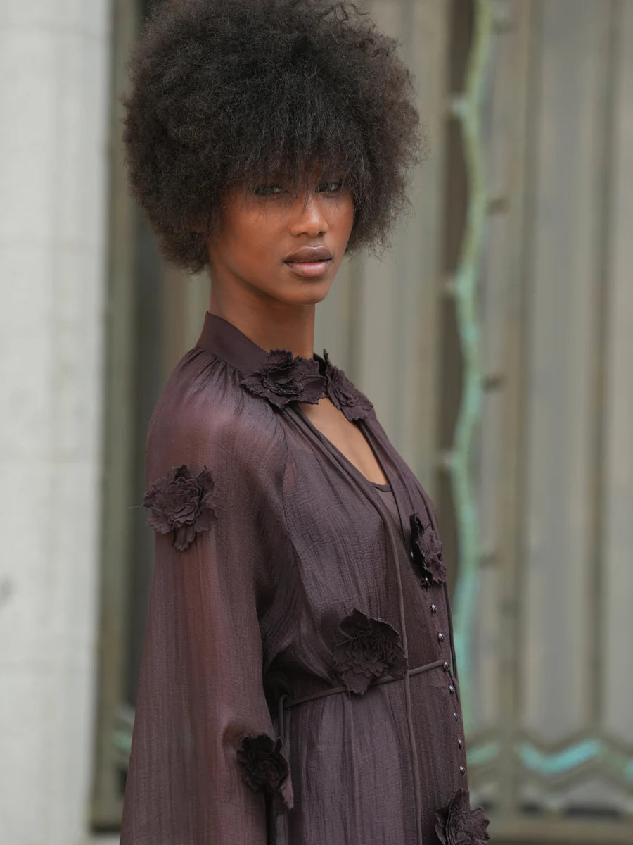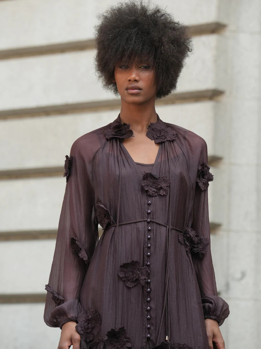 Vestido longo texturado, com detalhe de aplicações florais em 3D distribuídas por todo o corpo. Modelo com decote em V, botões forrados frontais e manga comprida com punho elástico. Saia fluida em camadas com franzido suave e cinto fino do mesmo tecido para marcar a silhueta. Inclui forro interior. Fecho lateral oculto.