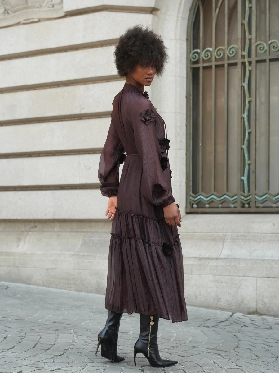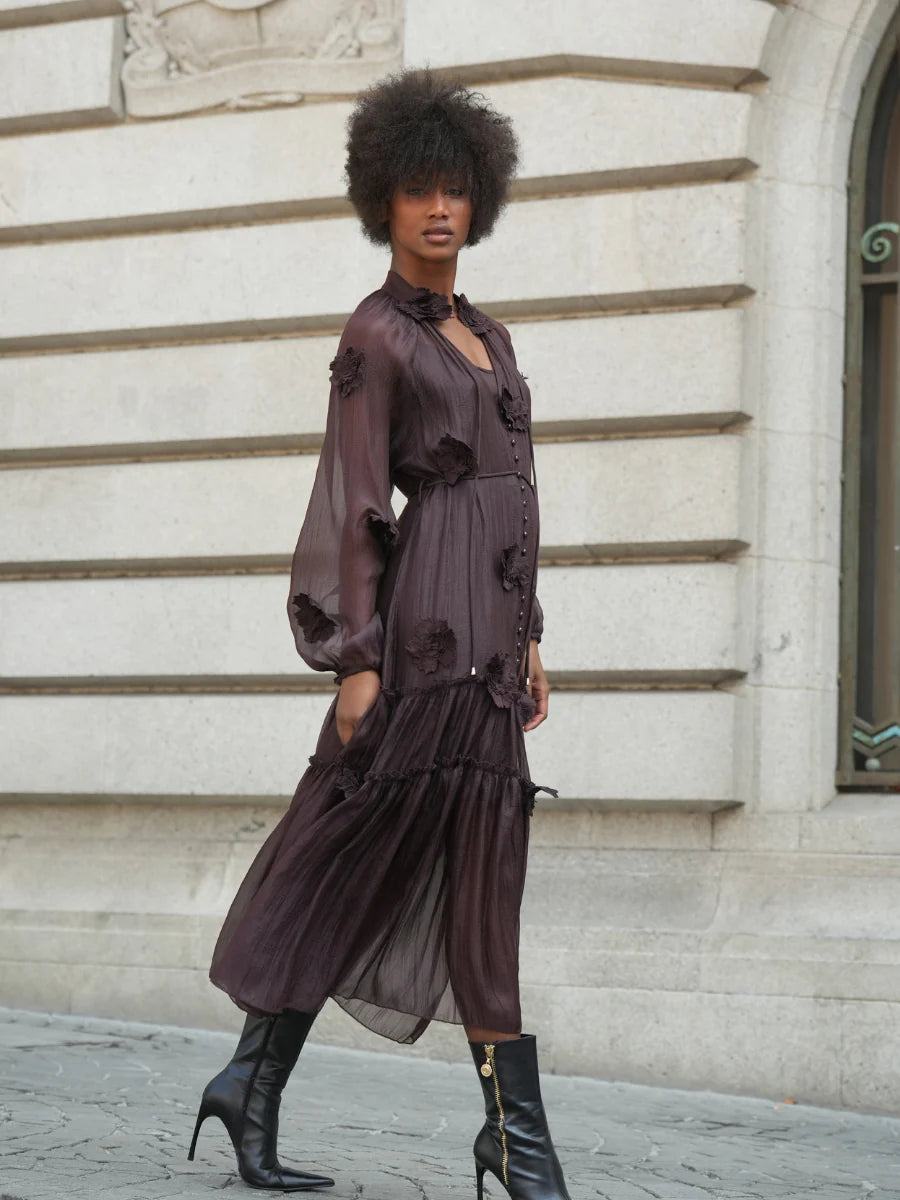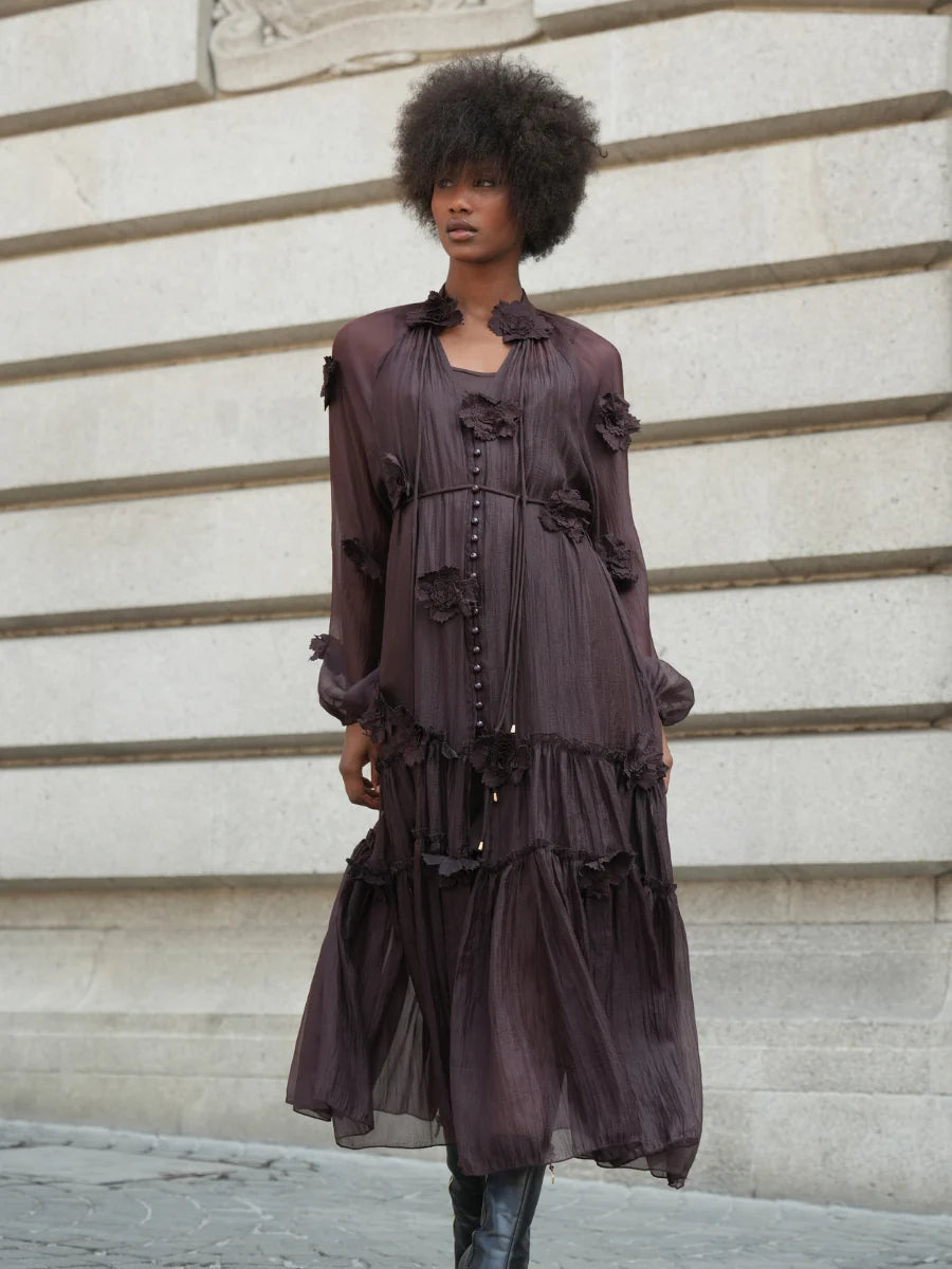Vestido longo texturado, com detalhe de aplicações florais em 3D distribuídas por todo o corpo. Modelo com decote em V, botões forrados frontais e manga comprida com punho elástico. Saia fluida em camadas com franzido suave e cinto fino do mesmo tecido para marcar a silhueta. Inclui forro interior. Fecho lateral oculto.